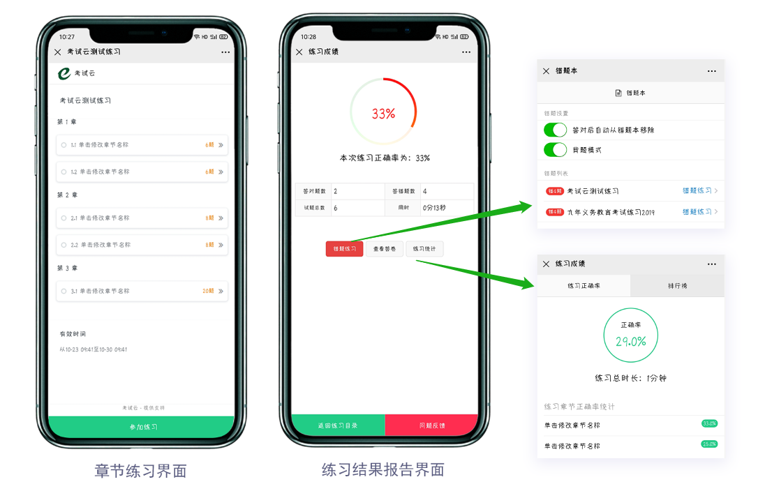 章节练习主要是对已经学习的知识进行专项练习,老师可以建立自己的练习题库,把试题按章节分类,学生可以进行章节刷题练习,类似于驾考宝典做题;