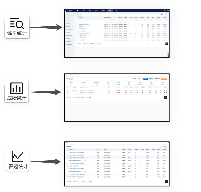 成绩统计,可以查看并分析考生模拟练习成绩、正确率、得分率、排名、答题情况、考生答卷及缺席人员等数据;
