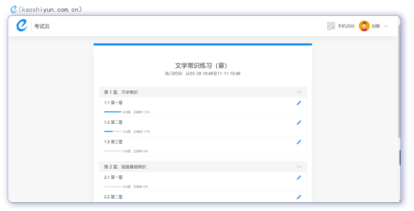 导入好试题之后,就可以进行练习创建了。考试云有章节练习和模拟练习两种练习模式,其中,章节练习主要是根据知识点分类,自定义章节来进行做题;模拟练习主要是创建模拟试卷来进行刷题。