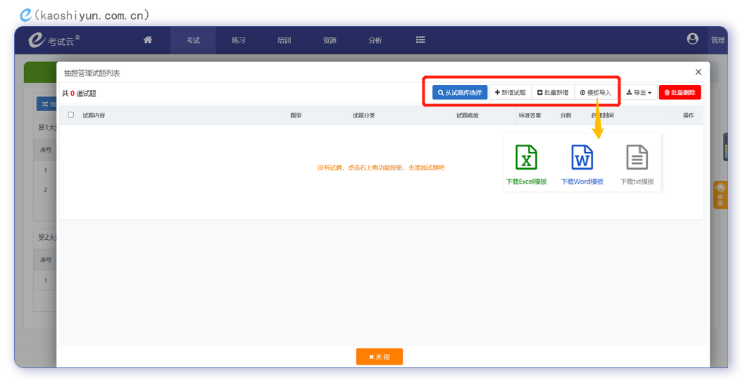 2、然后,选择一种组卷模式,去设计试卷结构,并根据组卷要求添加试题。考试云有多种批量导入试题的模板格式: