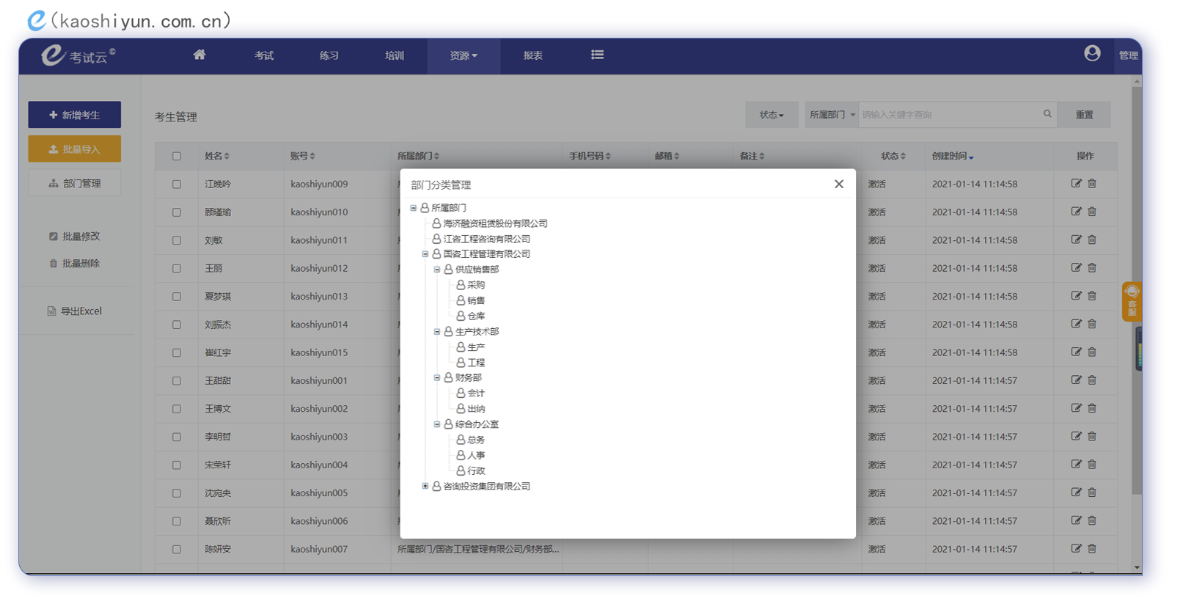 考试云的考生管理模块,对考生账号信息进行统一管理,如考生账号、密码、所属部门等考生信息。其中所属组织部门可以无限层级部门或岗位分类创建,从而组建组织架构,构建企业部门和岗位体系。