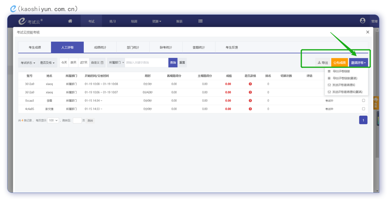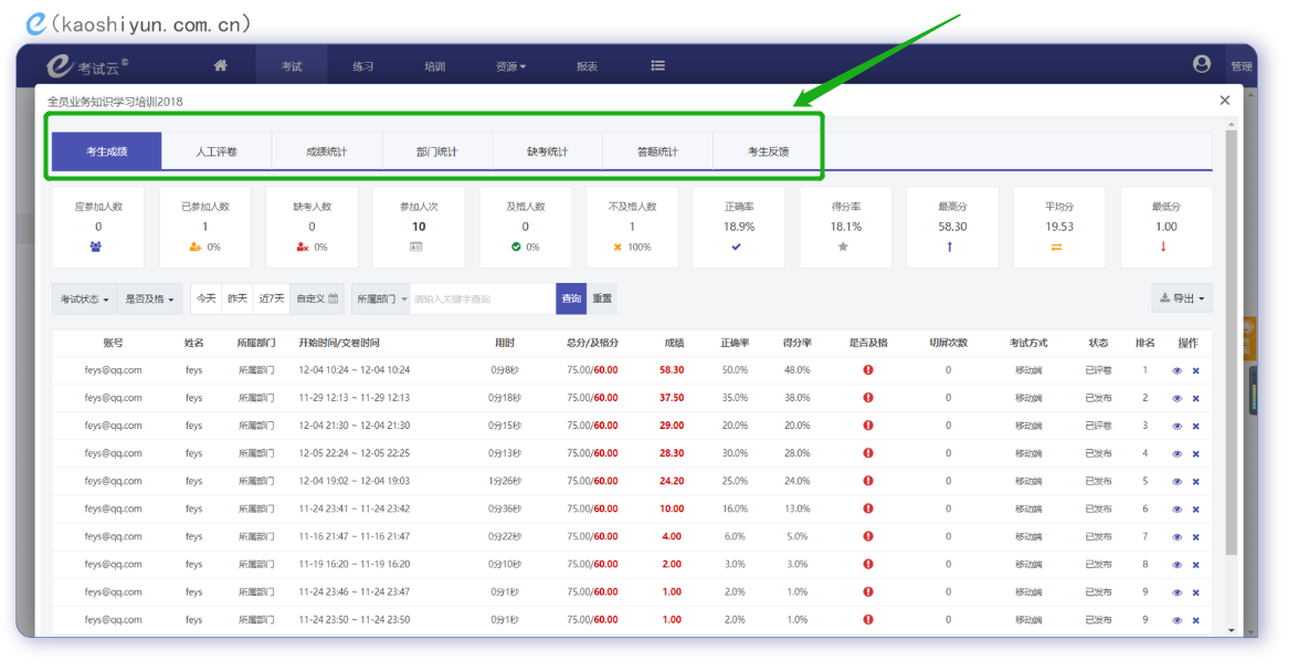 l 考生成绩:可以查看所有员工的考试分数、考试用时、正确率、得分率、排名、切屏次数、考试方式等。