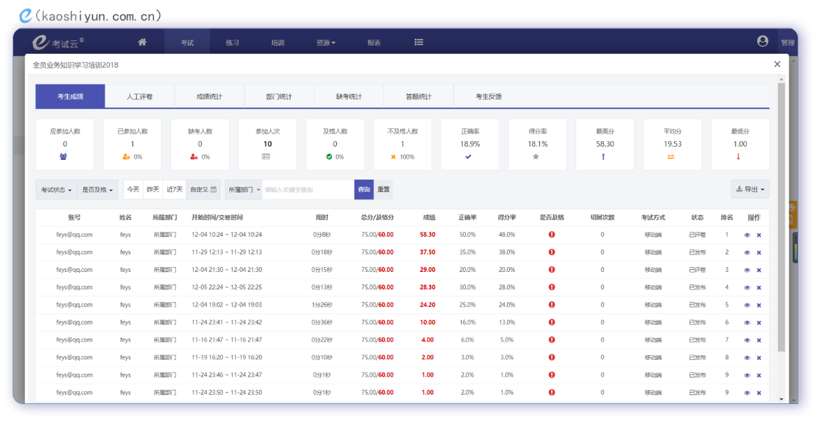 * 考试成绩报表:可以查看所有员工的考试分数、考试用时、正确率、得分率、排名、切屏次数、考试方式等。