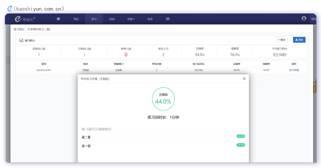 1、系统自动统计汇总了练习的参加人数、参加人次、正确率、错题率以及整场练习的平均练习时长,并将每个考生详细练习情况一一展示。