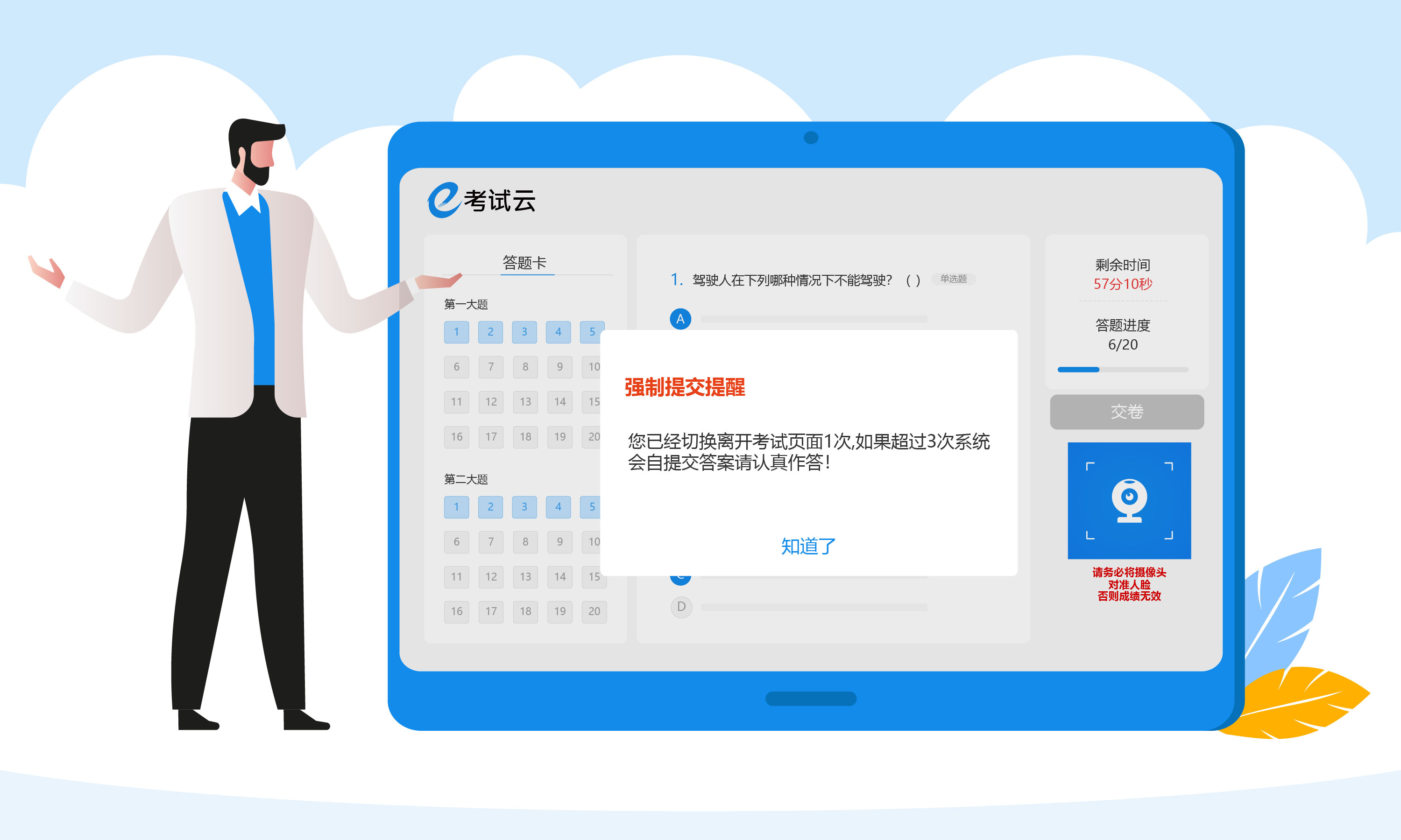 3、在考试过程中,摄像头保持全程打开,定时抓拍考生作答状态,监考老师在后台考试监控中可实时查看抓拍详情;若考生切换考试页面,想要去其他网页搜索题目,系统将给予提示,超过设置的可切屏次数,将强制提交考试试卷。