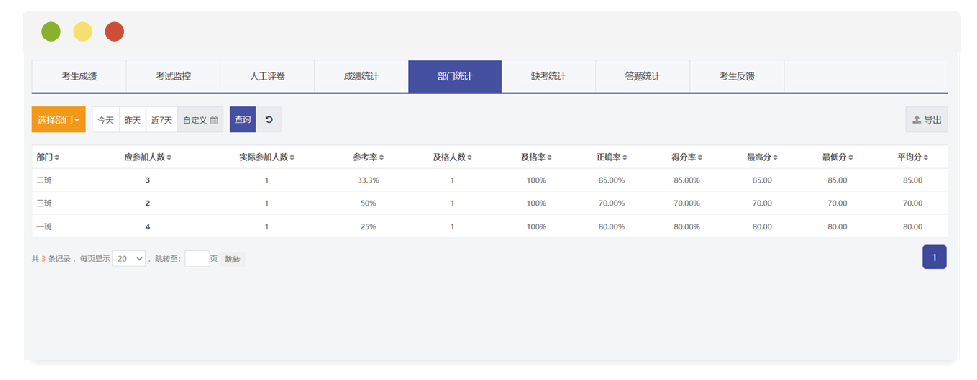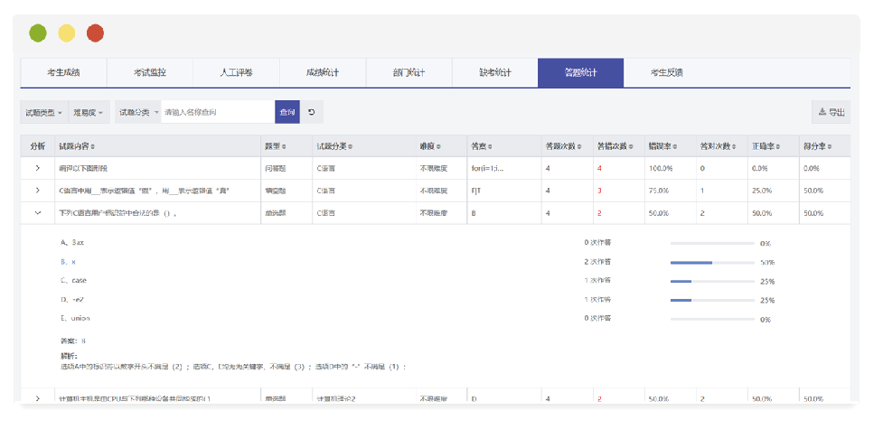 2、考试云将自动统计各科目考试每位考生的成绩、答题用时、得分率、正确率等数据,还能对同年级同科目之间的不同班级进行平均分、及格率、参考率等数据进行比对。