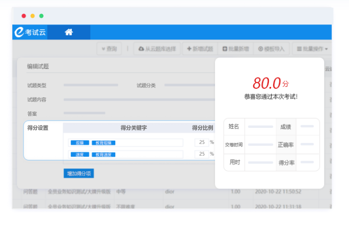 考试云在线考试系统凭借着多样的导题方式、灵活的组卷策略、完善的考试报表统计和智能的防作弊措施,在保障考试公平严肃的同时,还高效快速的完成了在线考试全流程。