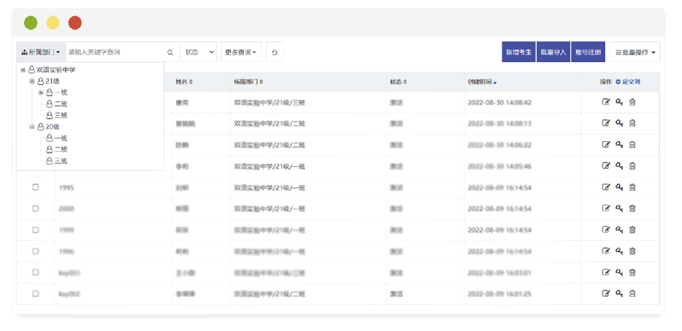 1、各班班主任将学生的名单整理好,用学号当做考生账号,使用考试云的Excel模板将考生信息导入到系统,让每个学生拥有一个参加考试的考生账号。
