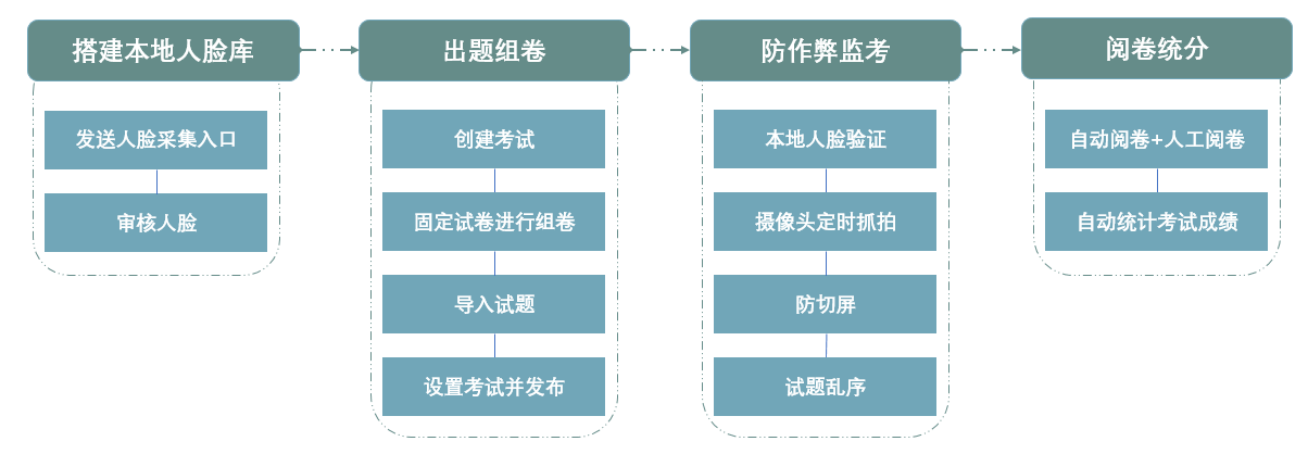 基于以上业务需求,考试云制定了“搭建本地人脸库——出题组卷——防作弊监考——阅卷统分”的考试方案。