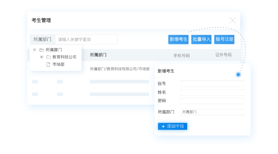 然后,在系统的考生管理中按照不同的团队来创建分类管理参赛人员,可以使用Excel模板快速添加参赛者名单,还能建立竞赛报名入口,让参赛者自主选择团队报名参加竞赛,节省人员信息收集时间。