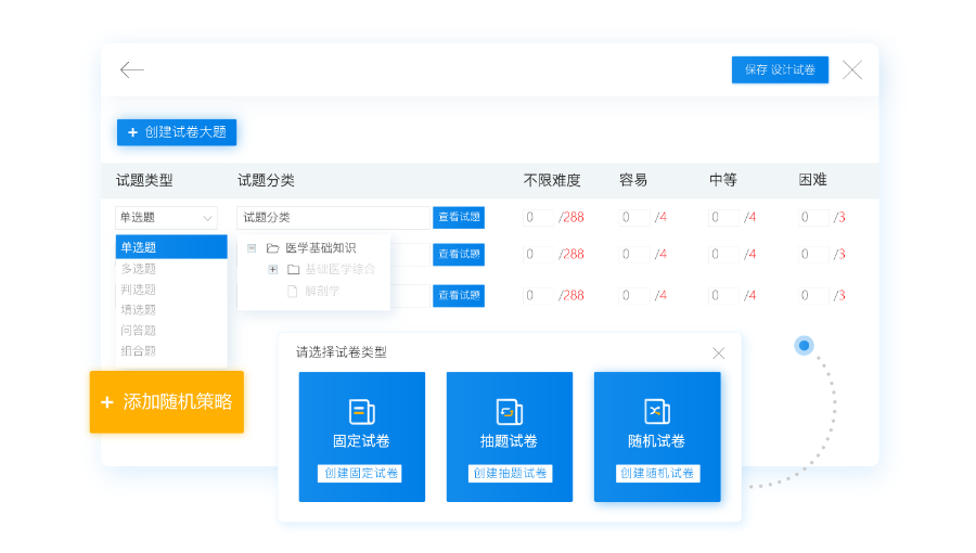 第二步,从答题系统的固定、随机、抽题三种试卷中选择一种试卷类型,设计试卷的框架结构,添加试题,可使用格式模板、批量新增的方式快速导入试题,节约试题添加时间。