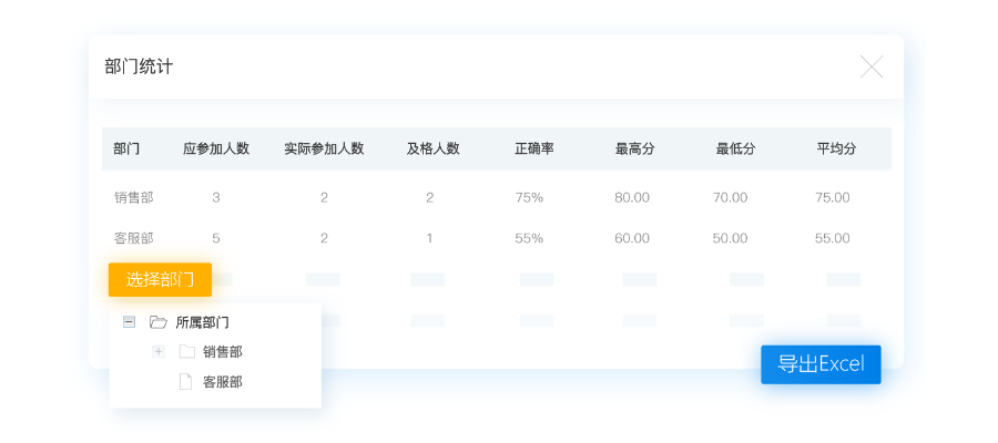 最后,考试云在线答题系统会自动整合分析竞赛的结果,竞赛举办方可以在系统考试报表的部门统计下查看到每个团队的人数参加情况、正确率、得分率、最高分、最低分、平均分等,按照平均分即可对每个团队进行排名。