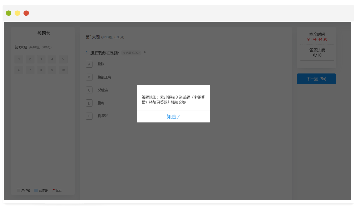 2)闯关答题:可设置整场竞赛允许答错的试题道数,当参赛者答错的试题数量超过设定的试题数时,答题系统会自动提交答卷,整个参赛过程中只能往前作答。
