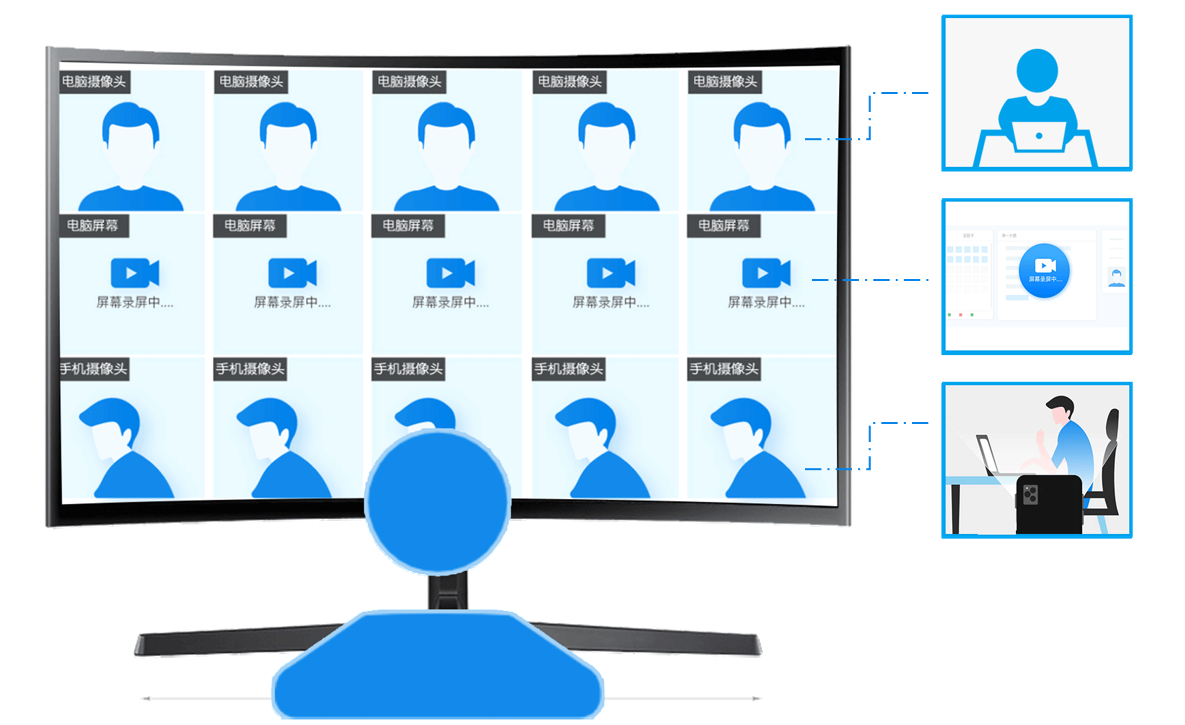 考试云在线考试系统有三路音视频监考防作弊设置,从电脑摄像头、手机侧方位摄像头以及电脑屏幕共享三个维度,全方位监控应聘者的考试环境和状态,防止远程替考、搜索答案等作弊行为。
