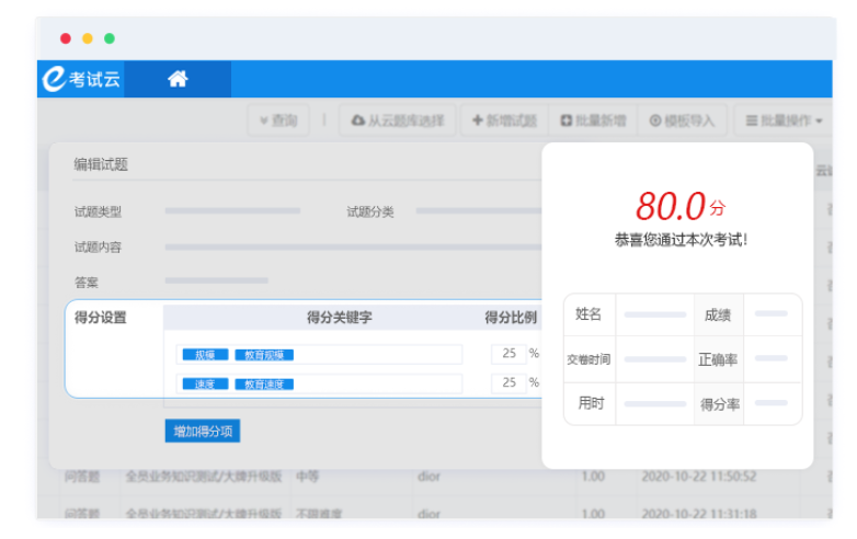 1、自动阅卷判分:单选题、多选题、判断题、填空等客观题,系统会根据已设置的正确答案和分数进行自动批卷判分;对于问答题这类主观题,可以通过设置“关键词”来实现精准判分,关键词设置得越详细,系统评分越准确,如考生填写的答案中包含管理员已设置的关键词,则可以得相应分数。