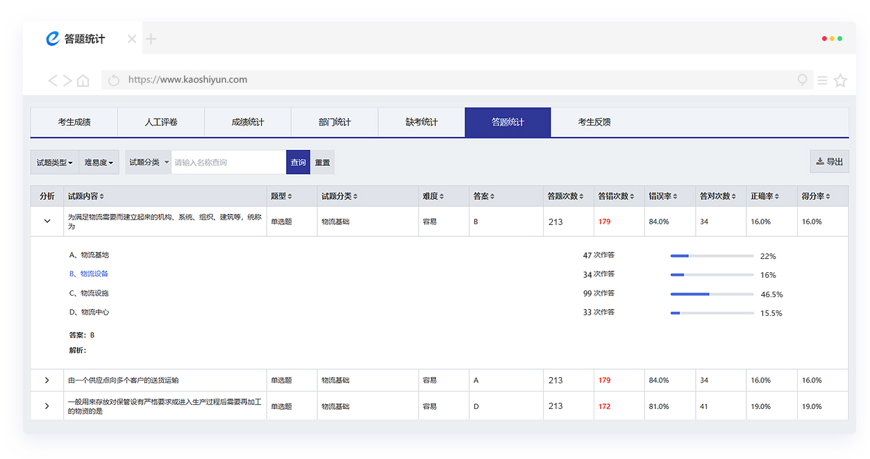 3、答题统计报表:统计了试题错题率、答题次数、答错次数、答对次数、正确率及得分率等;能够对比单个试题的作答情况的数据、分析选择题选项作答分布的情况。
