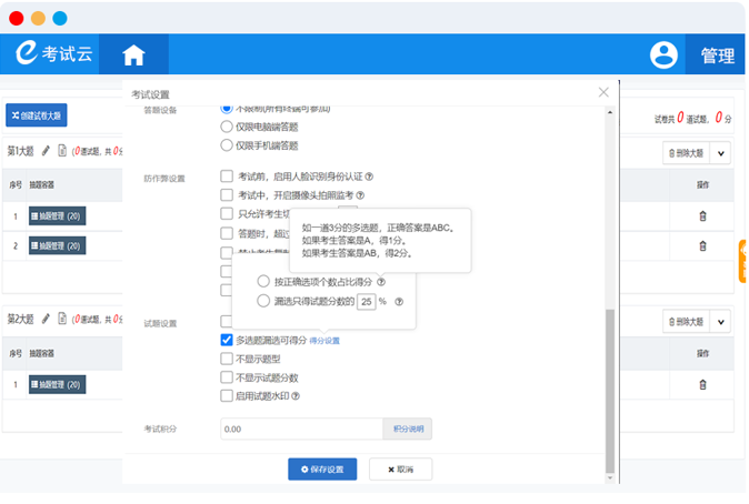 3、对于多选题或不定项选择题,有漏选判分设置,可以按正确选项个数占比给出得分或者设置漏选的话只能得到试题总分的百多比,这个百分比可自行设置。