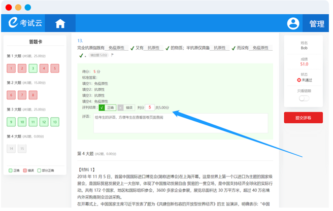 1、人工阅卷:在考试完成后,系统会根据设置的答案和得分点自动阅卷判分,对于判分非常精准的考试,可以进行人工复阅,若阅卷人觉得系统阅卷与考生的得分不一致,可手动修改考生该道试题的得分,还能添加对考生的评语。