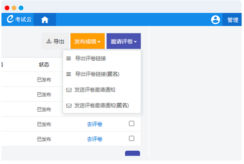 2、邀请他人评卷:组织在线考试时,或许有不同的科目和部门,对应不同的负责人,阅卷人无法自行去人工评卷,这时可以通过发送评卷链接或者邮件的方式邀请对应的负责人进行评卷,为了保证成绩的真实性,两者都能选用匿名的模式去发送邀请,在阅卷完成后,系统后台可直接查看到成绩和评卷结果。