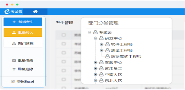 管理人员可以无限层级创建部门或班级分类便于管理区分,可用于部门、班级、岗位等分类体系构建,支持一键导入或导出,在考试、练习、学习时可以通过指定组织分类授权参加,有效对考生进行组织管理。