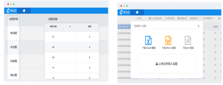 考试云中有模板导入(word、excel、TXT),可视化编辑界面的批量新增,需导入图片、视频、音频等使用的新增试题,支持多种试题类型(单选、多选、填空等),可以快速将海量试题整理导入试题库,试题库中还支持无限层级的创建试题分类,招聘者可以根据部门选择不同试题分类进行导入。