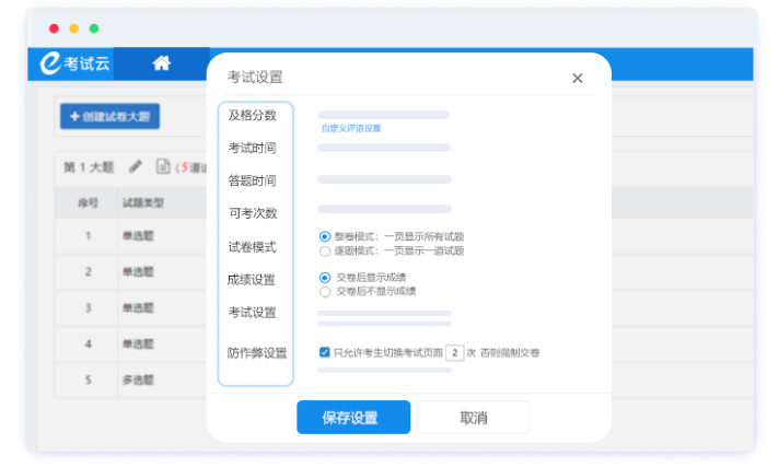 3、设置考试:对考试时间、及格分数、答题时间、可考次数、试卷模式、防作弊等进行设置。