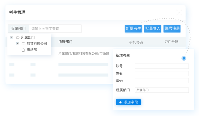 在线考试系统拥有考生管理功能。企业管理员创建不同的部门,将员工账号分类添加进对应部门中。有两种创建员工账号的方式,一种是管理员添加,另一种是让员工自己注册。