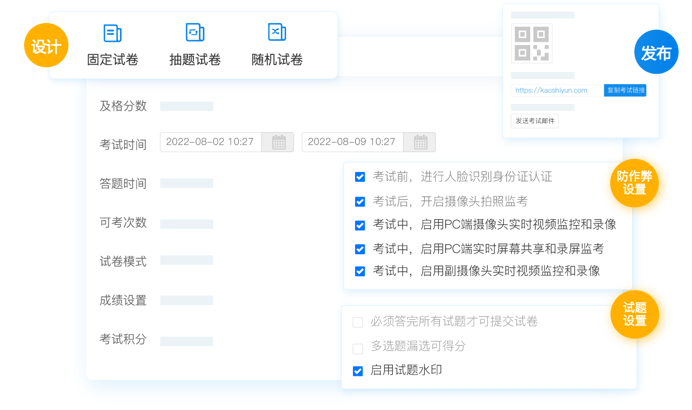 然后,设计试卷进行考试设置。系统有三种试卷可选,固定、抽题和随机试卷。创建大题添加试题,完成组卷进行考试设置。考试云在线考试系统支持设置考试时间、答题时间、答题设备、成绩显示方式、试卷、试题和防作弊措施等等。