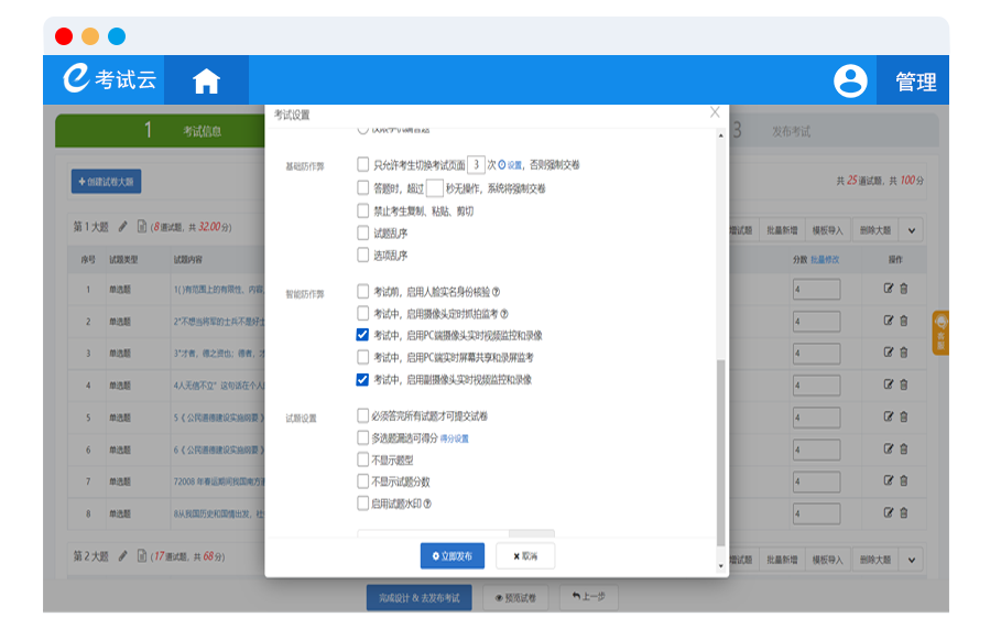 以上就是考试云建立一场双机位监考考试的具体操作步骤;作为专业且稳定的在线考试系统,考试云不仅拥有丰富的防作弊功能设置,还有简洁引导式的操作页面,让在线考试更简便、更严谨。