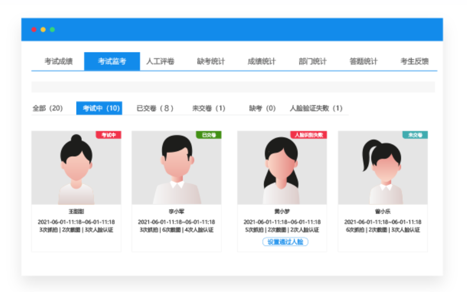 最后,发布考试通知,考生进入考试;管理员在系统后台的“考试监控”中可以看到不同状态下的考生监控信息和画面;除了实时监控之外,考试云双机位监控还提供录像功能并支持试后下载回放。