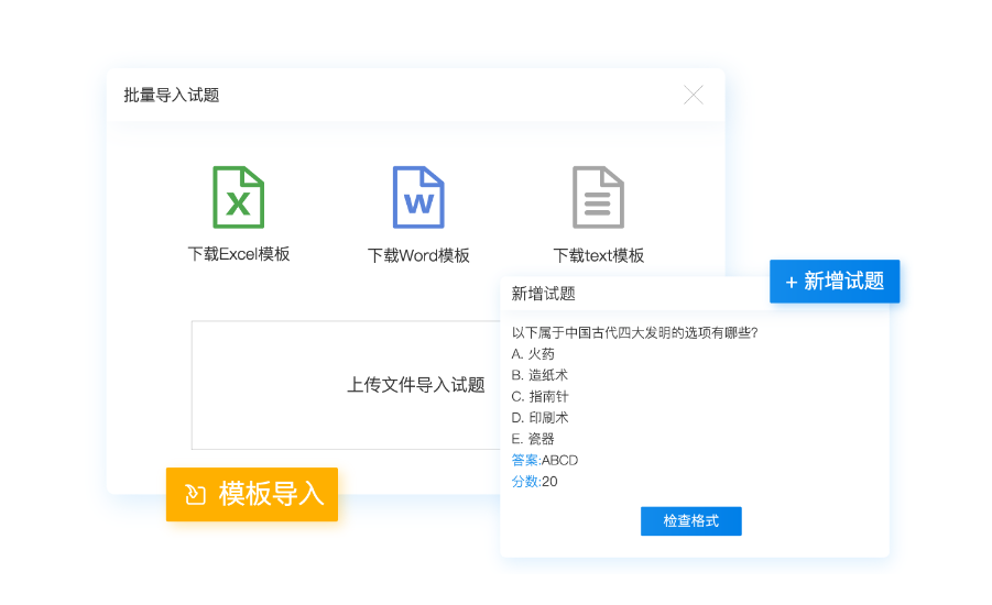 (1)、模板导入:有Excel、Word、Txt等三种模板导入可以选择,标准、通用化的试题导入格式,可批量导入海量试题。