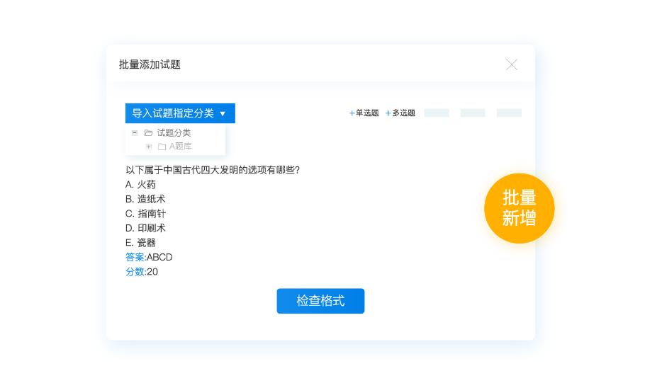 (2)、批量新增:系统提供快速整理、组织试题的可视化导题界面,不需要模板即可轻松导入大量试题。