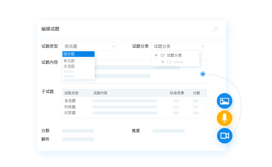 (3)、单个新增:多适用于阅读理解、材料题、代码题这种复杂题型,可使用音频、视频、图片的形式上传试题。
