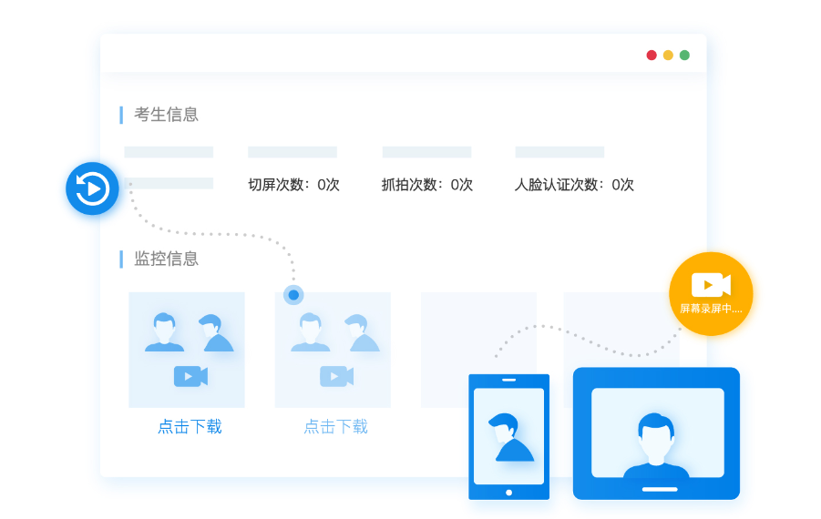 考试云在线考试系统拥有人脸核验、实时抓拍、三路音视频监考、双机位在线监控、屏幕共享、防切屏、长时间无操作交卷、禁止复制粘贴、试题选项乱序等多种防作弊措施,且组织一场严肃性线上考试只需以下三个步骤: