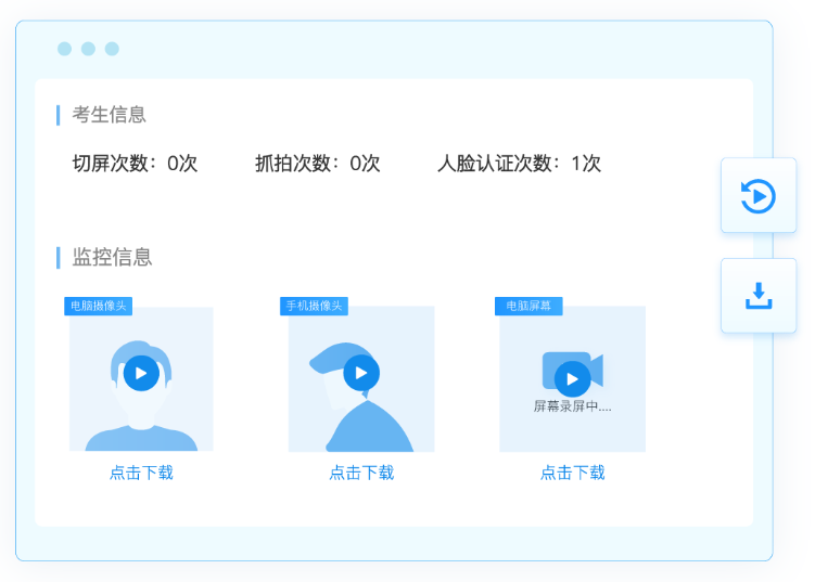 考试云线上考试系统对于考试过程中的三屏实时监控画面,可以同步进行录制存档,考试结束后,监考人员可以在系统后台实时查看或下载监控回放;远程监考视频的录制回放,可以确保在线考试有据可依,保证监考的完整性。