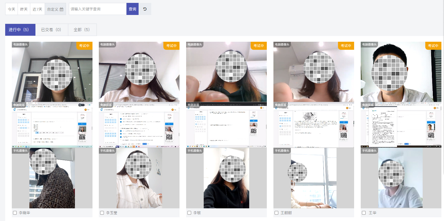 考试云线上考试系统在考试的过程中,将通过电脑前置摄像头、手机侧方位摄像头以及电脑桌面实时共享屏幕三个视角;监考人员在管理端后台,可以看到三屏的实时画面监控,监控每一位考生作答的环境、面部表情、答题操作行为及上半身行为,模拟现场监考的效果,以此保障在线考试的严肃性。