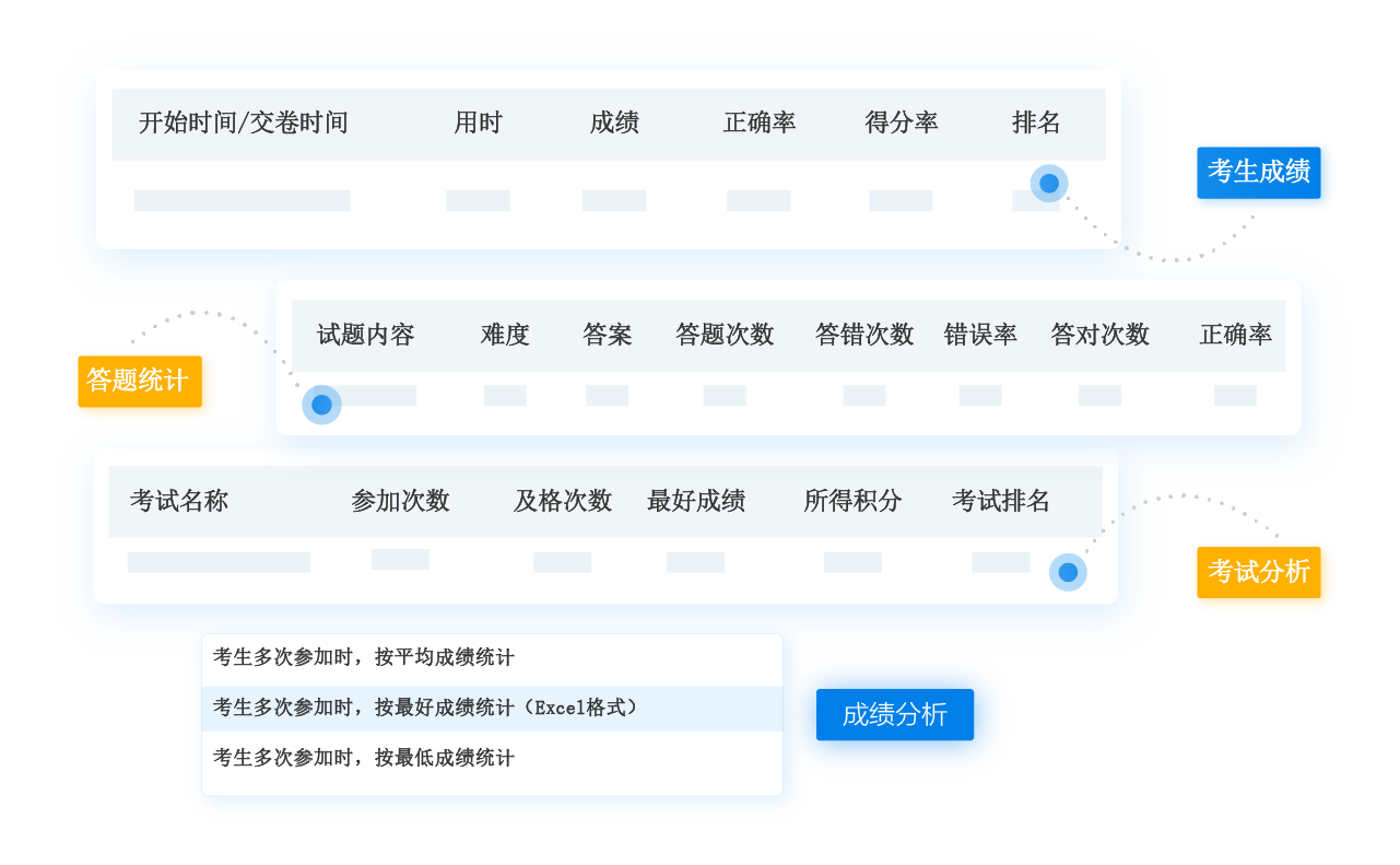 在线考试系统提供了数据统计和分析功能,可以对参赛者的成绩进行全面分析,包括得分、正确率、最高分、最低分、平均分、及格率、排名、答题情况等。