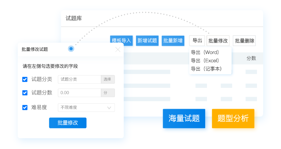 考试云提供Excel、Word、TXT模板导入和批量新增两种大量以及单个新增的快捷导题方式可选,能为试题无限层级创建分类规范管理,支持批量修改、删除、导出、查重试题内容,还能对重要试题标记标签。