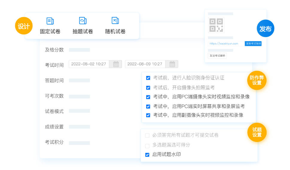 系统还有基础性的防切屏、无操作交卷、禁止复制粘贴剪切、打乱试题选项顺序等防作弊措施,以及智能性的人脸实名认证、摄像头定时抓拍、三路音或双机位视频监考等防作弊措施;能够全面确保党建知识竞赛的严肃公平。