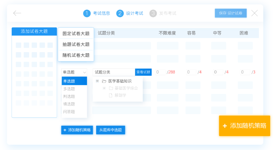 抽题试卷大题:企业可以添加抽题策略,指定抽题试题到系统容器中,设置好抽题数量和分数,系统会在容器中随机抽取对应数量试题组卷。