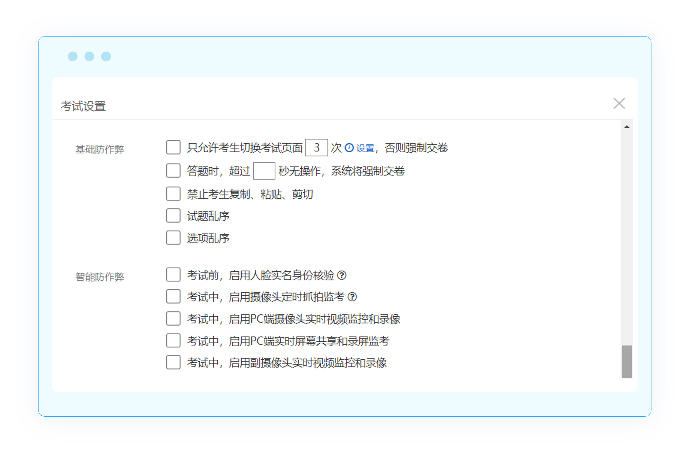 基础防作弊:包含防切屏、规定时间无操作交卷、禁止考生复制粘贴剪切、试题乱序、选项乱序。