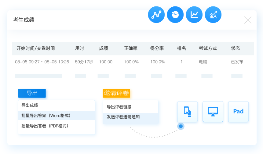 考试结束后,在线考试平台能自动阅卷判分,只有主观性较强的试题,比如阅读理解题等等,企业能邀请各岗位负责人协同评卷,提高阅卷工作效率。