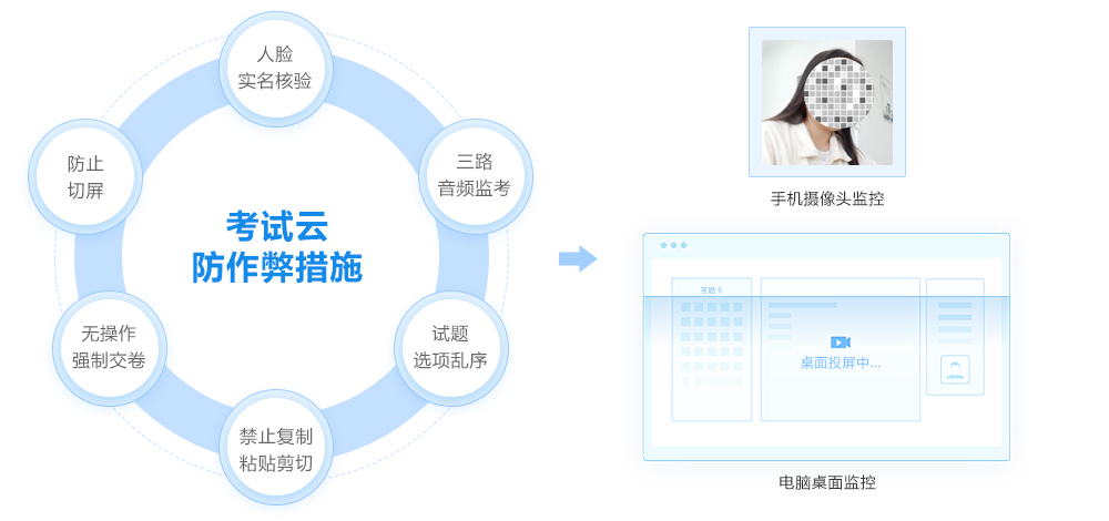 “考前人脸核验(防替考)——考中音视频监考(防作弊)——竞赛答题模式(限时作答)——考后回看监考视频(有据可查)”。