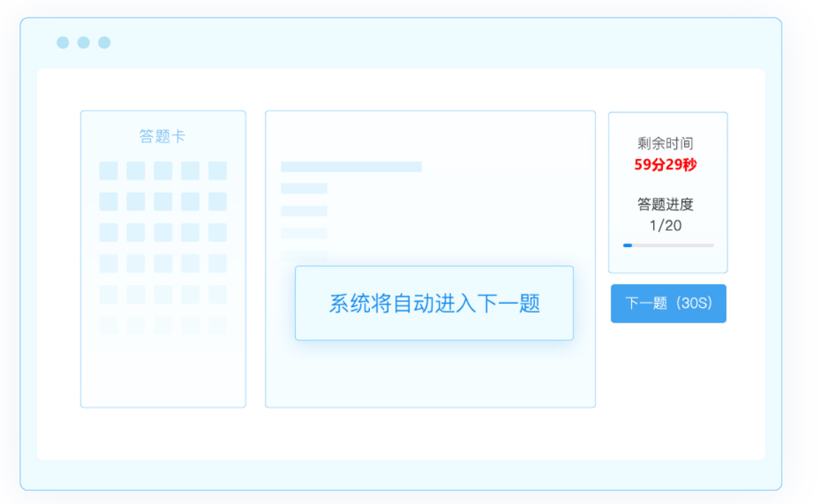 参考人员在做题时,每道试题限时30秒作答,若超过时间无作答,系统将自动进入下一题;进入下一题之后,不可回退至上一题。
