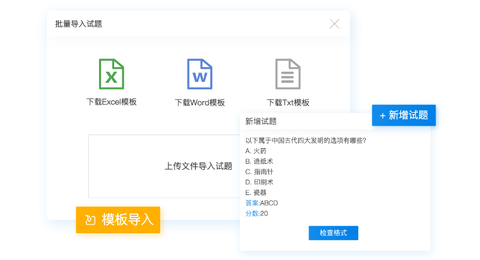 1、格式模板:在线答题系统有Word、Excel、TXT三种标准通用化的导题模板,可一次性导入大量试题,能够提高试题录入的效率;其中,Word模板可以批量导入图片试题。