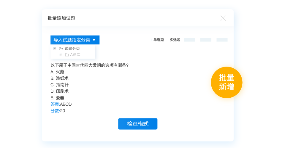2、批量新增:是在可视化的编辑页面下批量整理、组织试题,可以直接为试题指定分类,且系统提供了单选、多选、判断、填空、问答等题型的填写模板,轻松批量导题。