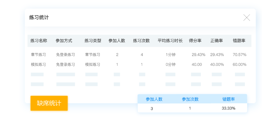而在练习结束后,考试云会自动记录错题生成错题本,学员可以在错题本中对错题进行重练,加强对于知识点的掌握。系统的后台也会统计学员的答题时长、正确率、错题率等练习情况,并能根据错题率自动计算试题难易程度,对于难度较高的试题可着重进行讲解。