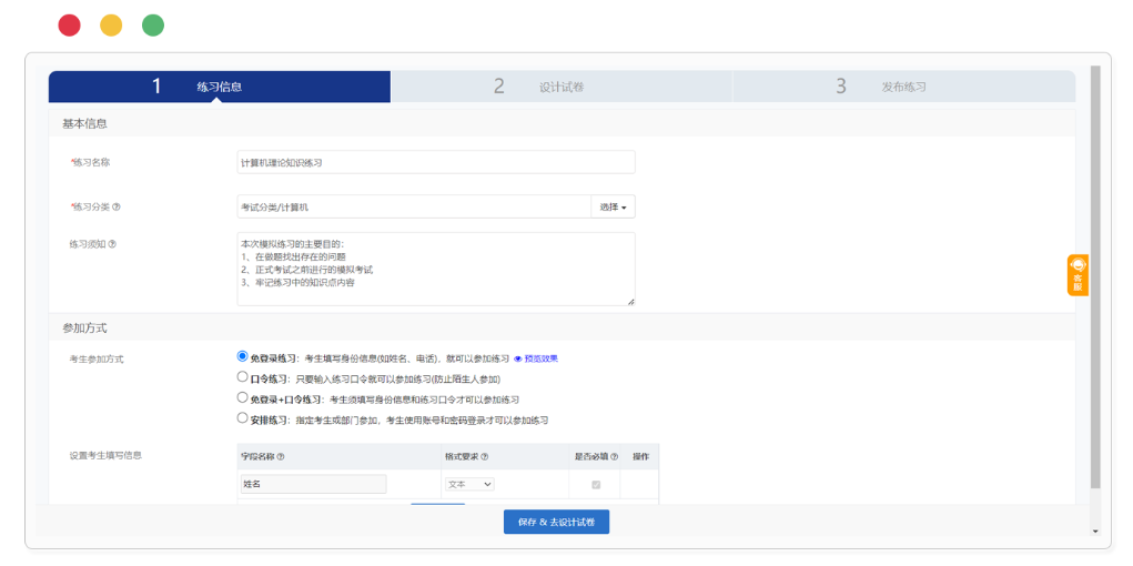 在考试云“练习”模块下点击创建练习,为练习填写基本信息,如名称、分类、注意事项等,便于查找管理练习;然后选择参加练习的授权方式,有免登录、口令、免登录+口令、安排练习四种方式,免登录的练习方式能够自行设定学员需要填写的信息;安排练习需指定参与练习人员的账号或部门,只有通过账号密码登录才能参加练习答题。