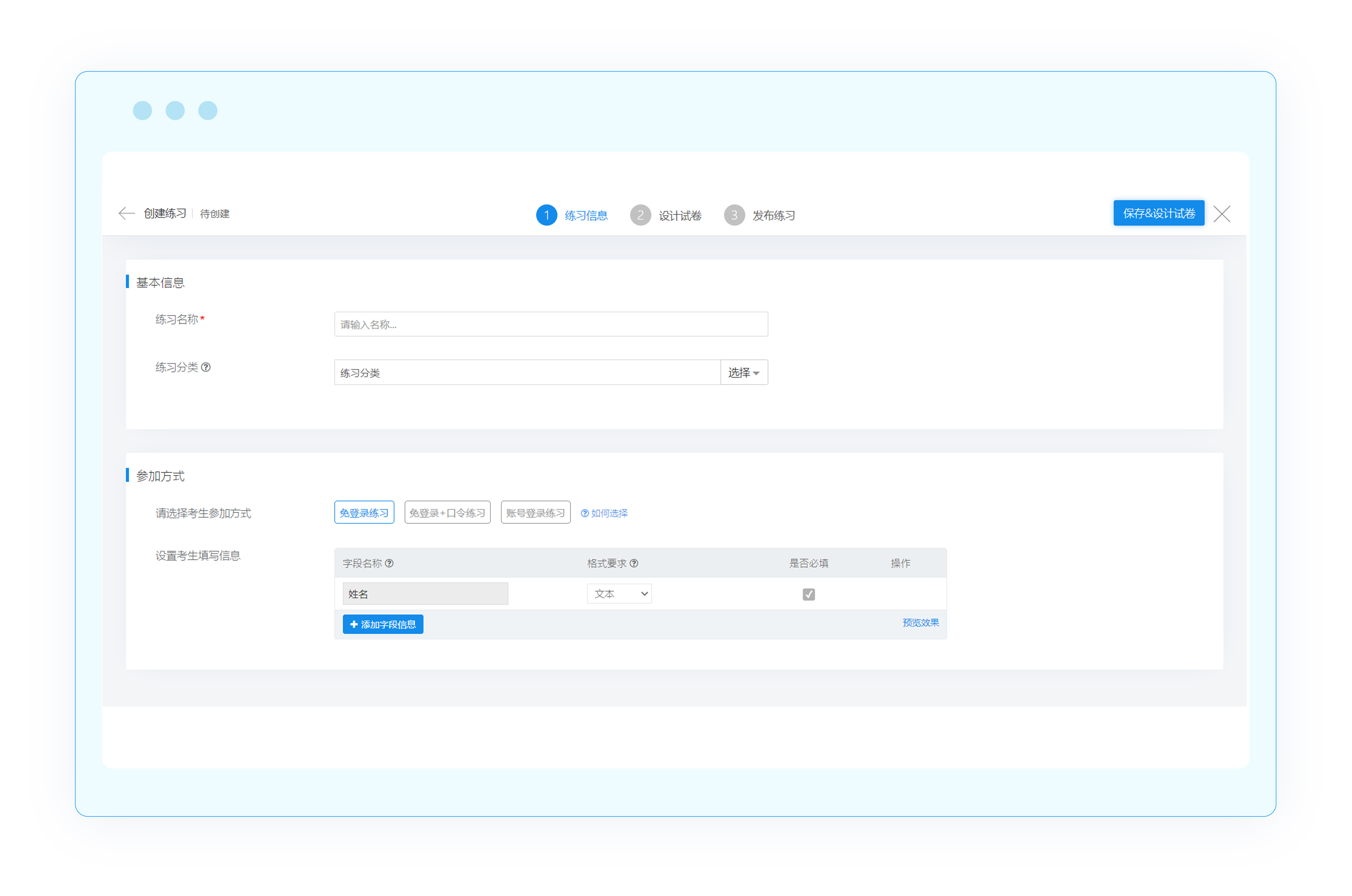 第一步,创建练习,填写练习名称和分类,再选择学员参加练习的方式,免登录方式能设置学员需要填写的信息字段;免登录+口令方式是在免登录方式的基础上,增加了数字口令;账号登录方式能指定学员参加,只有被指定的学员能通过账号密码进入练习。