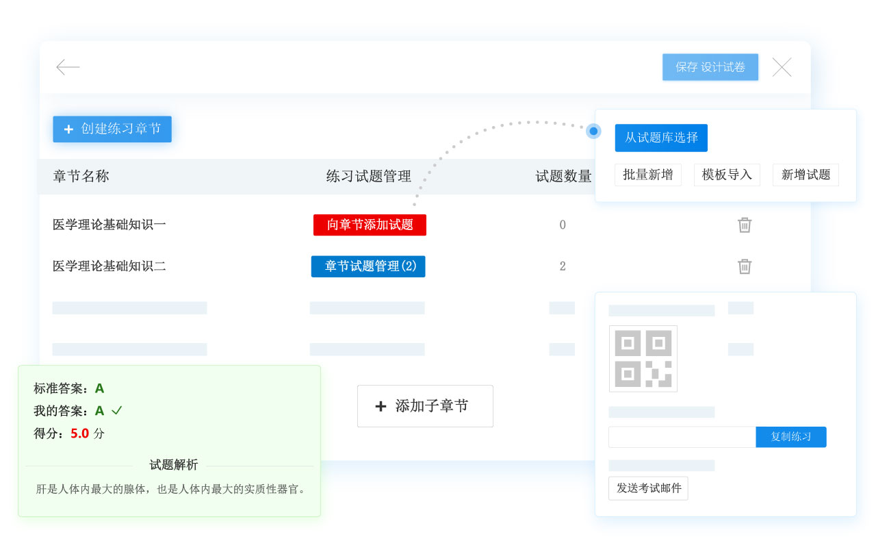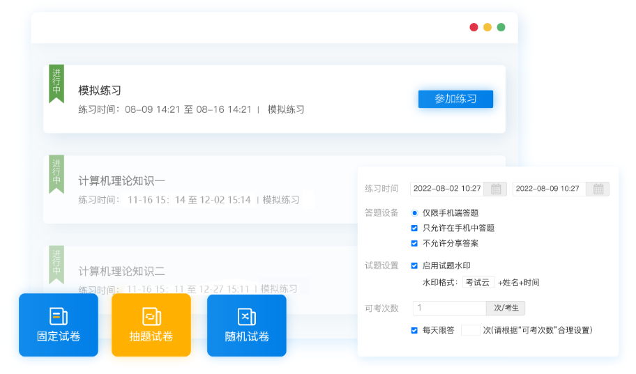 模拟练习:可以设定练习的次数,和每日能答题的次数,适用于每日任务式练习。可以自由组合固定试卷大题、抽题试卷大题或随机试卷大题组卷,再设置练习时间、答题时间、答题设备、试卷、试题、系统自动记录错题等等。